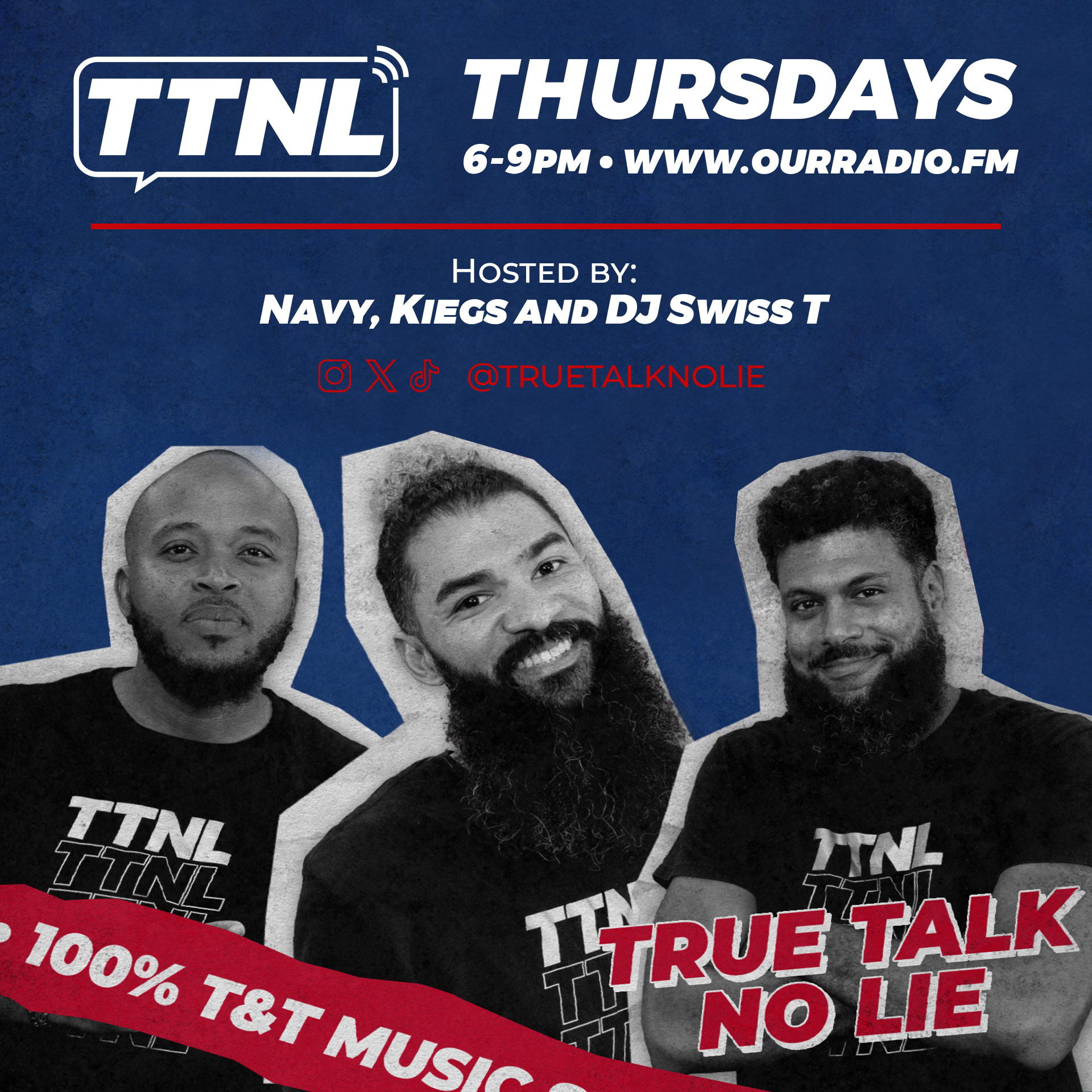 TTNL – True Talk No Lie hosted by Navy, Kiegs & Dj Swiss T! Every Thursday 6-9pm on ourradio.fm playing 100% T&T Music, showcasing and highlighting the stars of tomorrow.